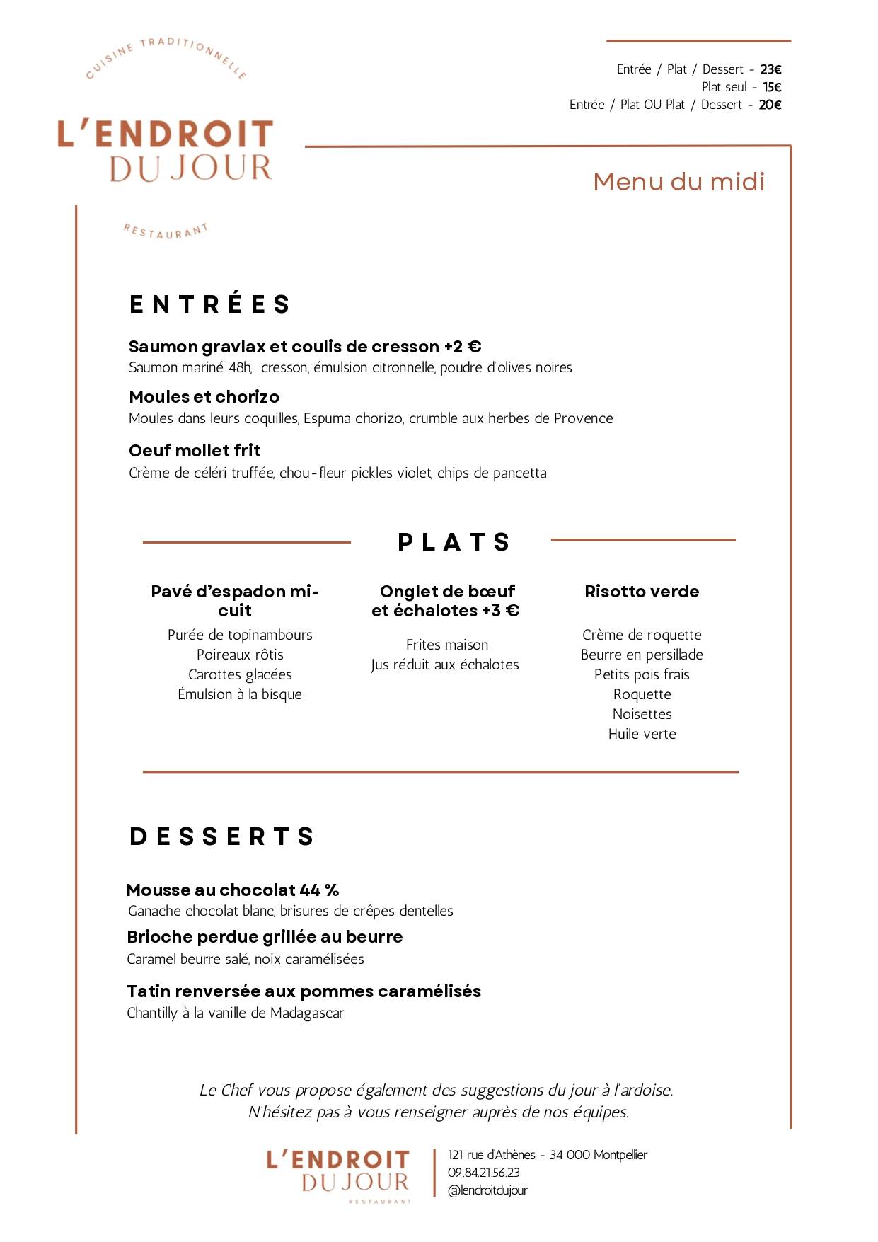 La carte de ce resto à Montpellier évolue au fil des saisons et des arrivages. Chaque plat est pensé pour sublimer les produits locaux, avec une cuisine méditerranéenne et française, faite maison, qui respecte le goût des ingrédients et l’équilibre des saveurs.